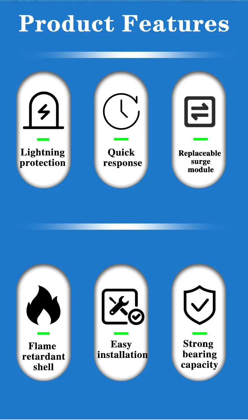 আমাদের সার্জ বিদ্যুৎ গ্রেপ্তারকারীরা সৌর শক্তি সিস্টেমে বৈদ্যুতিন সরঞ্জামগুলিকে বিদ্যুতের স্ট্রাইক, গ্রিডের ওঠানামা বা ইলেক্ট্রোস্ট্যাটিক স্রাবের কারণে সৃষ্ট ভোল্টেজের প্রভাব থেকে কার্যকরভাবে সুরক্ষা দিতে পারে। এই ধরণের সুরক্ষা ইনভার্টার এবং মনিটরিং সরঞ্জামগুলির মতো মূল উপাদানগুলির নিরাপদ অপারেশনের জন্য খুব সহায়ক।